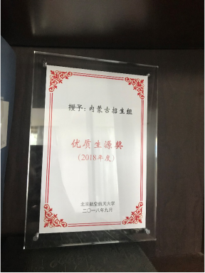 我院作为内蒙古招生组,在院领导、老师和学工办成员的努力下,此次招生工作成果显著,在呼和浩特市、包头市、赤峰市等重点中学均顺利进行了优质生源基地的授牌,获得了我校“优质生源奖”。