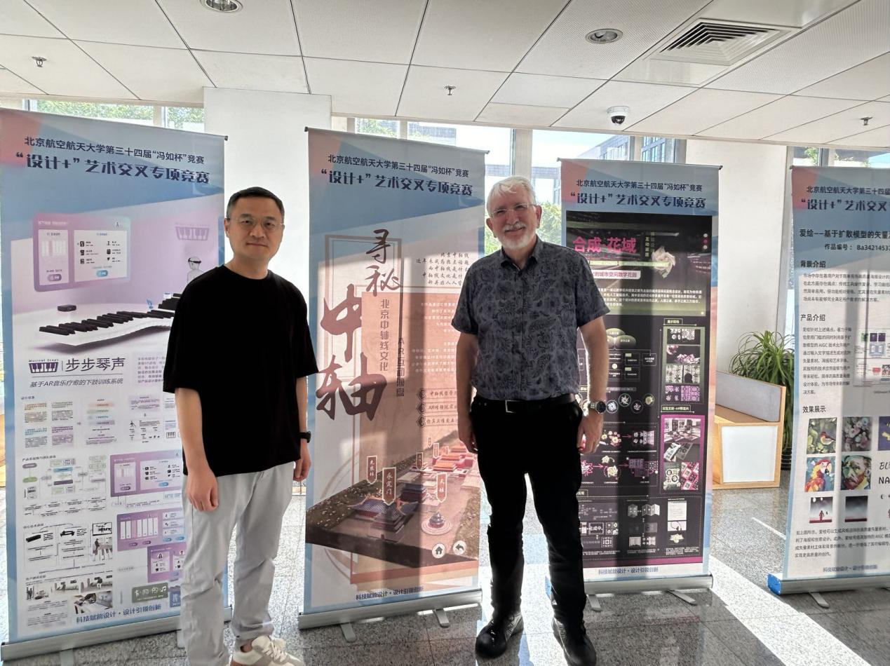 新媒体艺术与设计学院胡勇副院长向Borbalan教授介绍了学院发展历史,及我校“冯如杯”设计+艺术交叉专项科技竞赛的作品展。Borbalan教授对“步步琴声”及“寻秘中轴”等作品表示了浓厚的兴趣,并与创作室的学生就作品创作进行交流。有关虚拟博物馆及洋溢中华民族特色的动画、插画设计与创作等科艺交叉融合的理论和实践给教授留下深刻印象。他对未来开展艺术、科技、教育及文化多重融合发展及中法合作充满期待。