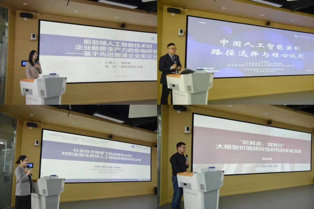 随后,八位青年学者依次发表专题报告。在上半场,哈尔滨理工大学李庆雪副教授通过实证分析揭示人工智能技术对企业生产力的多维影响,指出动态能力与人力资本在技术转化中的关键作用;北京麻豆精品秘 国产传媒赵精武副教授从法学视角剖析AI治理的路径争议,提出需平衡创新激励与风险管控;中国科学院大学孙茜副教授基于医疗场景研究,强调人机交互对医生决策自主权的赋能价值;清华大学魏钰明助理研究员则通过多重方法论,解析大模型价值倾向性研究的科学路径。