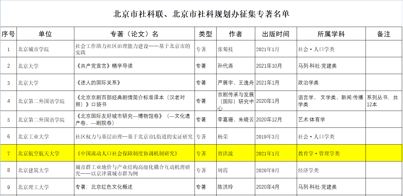 近日,北京市社科联、北京市社科规划办为更好地宣传、展示首都社科单位、专家学者的最新理论专著及其他成果,遴选近两年相关业务领域的社科研究成果(以专著和论文为主),共有32本专著入选。我院贾洪波教授2021年出版的专著《中国流动人口社会保障制度协调机制研究》入选,是北京麻豆精品秘 国产传媒唯一入选专著。