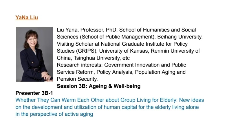 我院教师刘亚娜教授于5月11日参加由日本一桥大学(Hitotsubashi University(HU))主办的2023年度SIGMA研究研讨会/第19届养老金、保险和储蓄国际会议(Annual SIGMA Research Symposium 2023/19th International Conference on Pensions, Insurance and Savings),并做题为“Whether They Can Warm Each Other about Group Living for Elderly:New Ideas on The Development and Utilization of Human Capital for The Elderly Living Alone in The Perspective of Active Aging”(《抱团是否可以取暖———积极老龄化视域下独居老年人养老人力资本开发利用的新思路》的主旨报告。