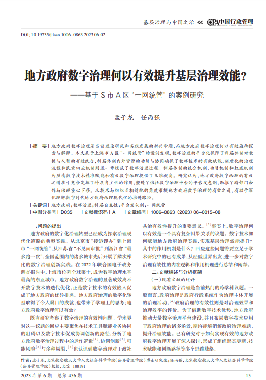 我院博士研究生孟子龙与任丙强教授的合作论文《地方政府数字治理何以有效提升基层治理效能?——基于S市A区“一网统管”的案例研究》在中文权威期刊《中国行政管理》上发表。该研究提出了“地方政府数字治理有效之道”的理论解释框架,指出地方政府数字治理的有效之道在于科层自主性(Bureaucracy Autonomy)、平台发包制(Platform Contracting System)以及跨部门合作的动力合流。该项成果不仅丰富了政府数字治理的理论分析概念,也提供了地方政府数字治理与城市政府数字化转型的新议题。