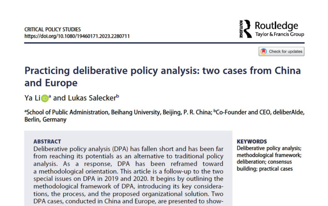 李亚教授与Lukas Salecker合作的文章Practicing Deliberative Policy Analysis: Two Cases from China and Europe近日在Critical Policy Studies期刊上在线发表。
