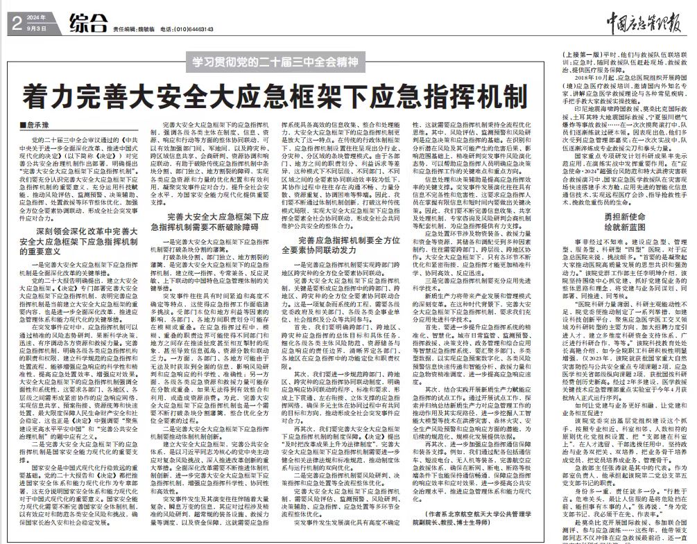 再其次,我们要完善大安全大应急框架下应急指挥机制的制度保障。《决定》提出“及时把改革成果上升为法律制度”,完善大安全大应急框架下应急指挥机制需要进一步健全相关法律法规和标准规范,推动制度体系与运行机制的双向优化。