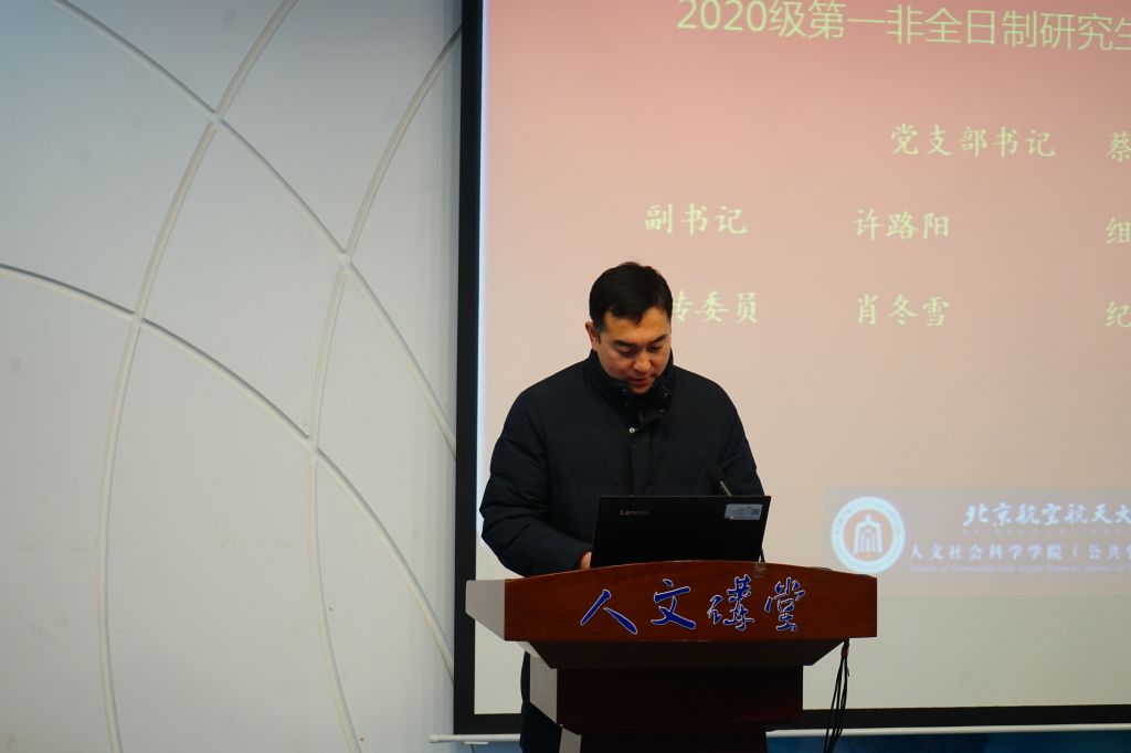 1月8日上午,人文公管学院2020级第一非全日制研究生临时党支部(以下简称“第一临时党支部”)成立大会在人文讲堂召开。学院党委书记王琪全,党委研究生工作部副部长王扬,学院党委副书记张驰,MPA班主任代表韩梦出席大会,会议由专职辅导员张同玉主持,2020级MPA非全日制研究生党员代表参加会议。